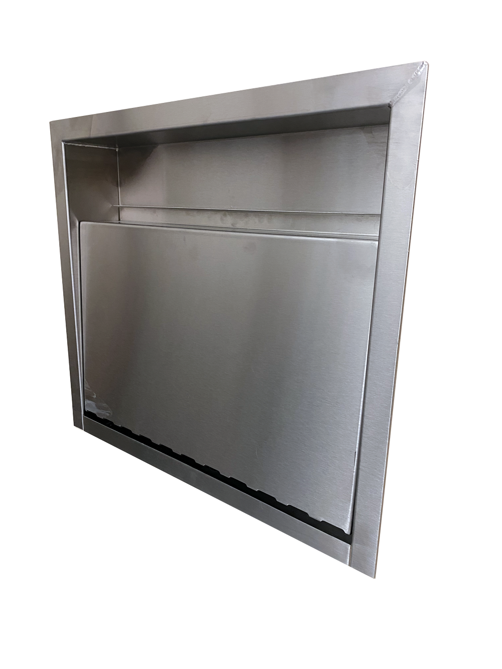 Lavabo pliant robuste en acier inoxydable de 1,5 mm d'épaisseur, composé de deux parties. Dimensions du bassin : 490 × 300 mm. Équipé d'un raccord d'évacuation des eaux usées de 25 mm. Fabriqué selon un plan technique.