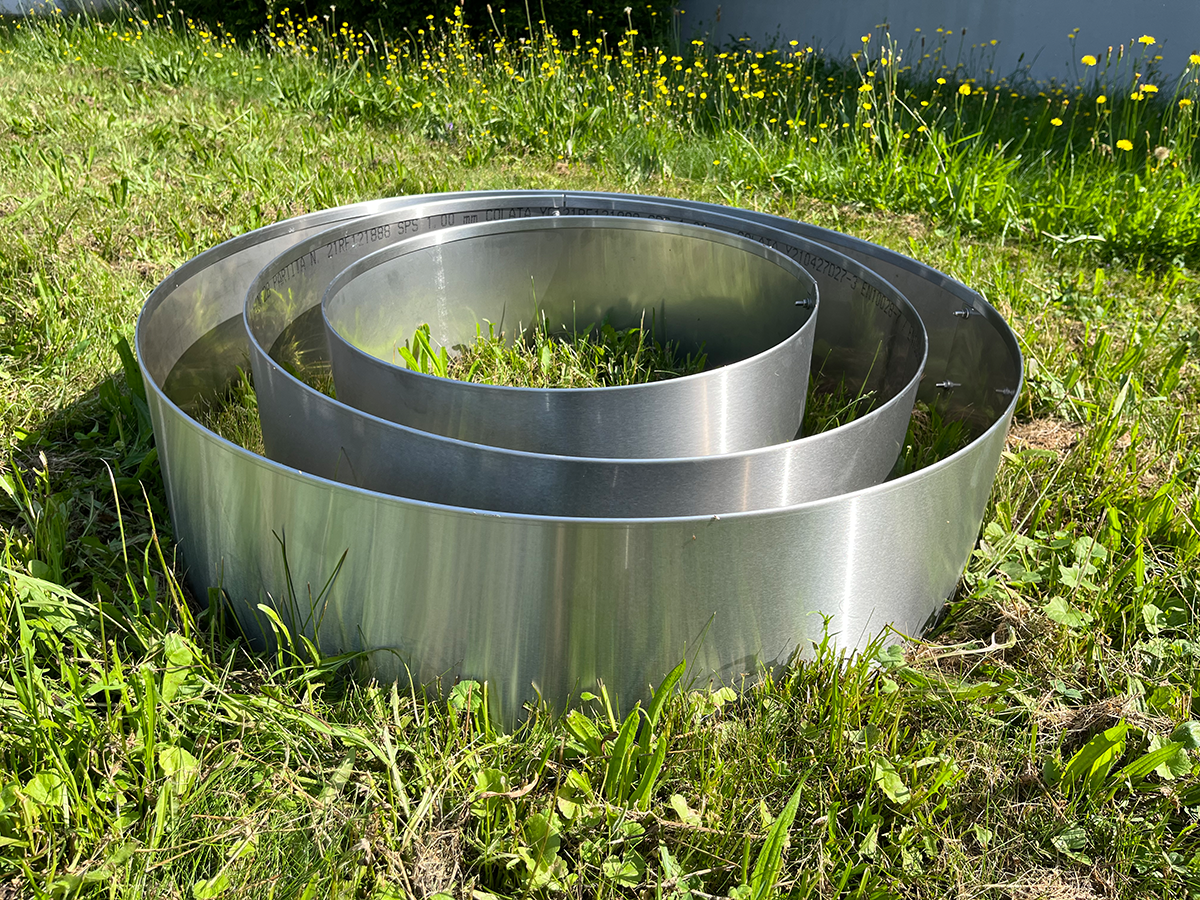 Ronde gazonrand, jaarring, afgeronde rand aan de bovenkant door een vouw, 200 mm hoog, gemaakt van hoogwaardig 1 mm roestvrij staal, buitenoppervlakken geborsteld/geslepen, korrel 320